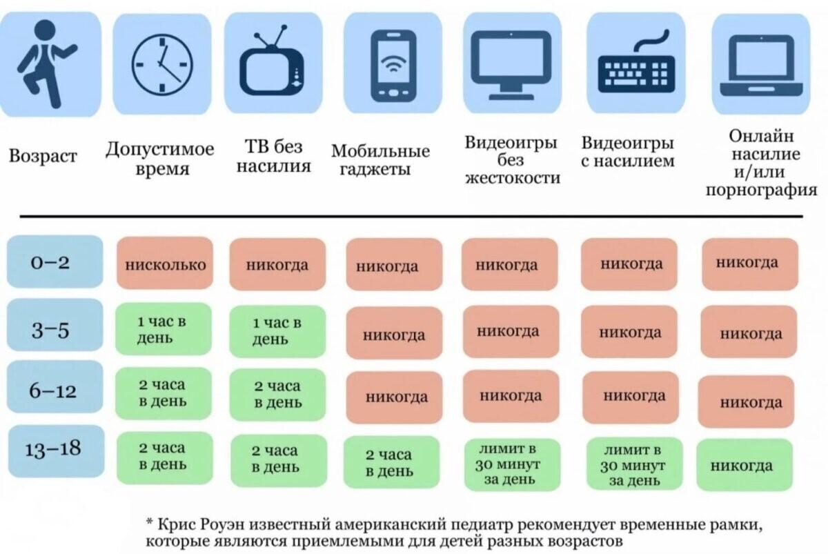 Оптимальное количество времени, проводимое за экраном, должно составлять не более указанного ниже в зависимости от возраста: