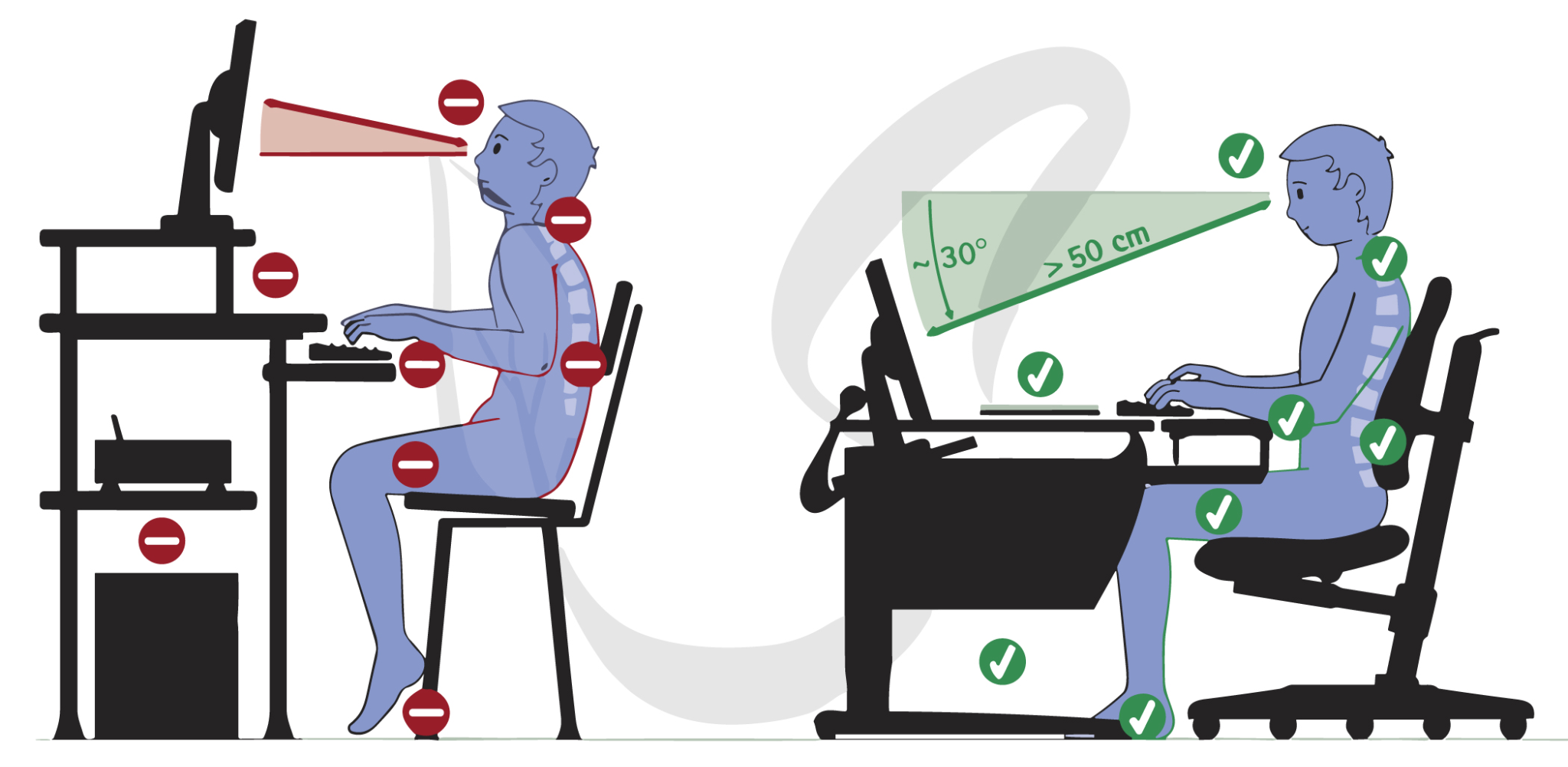 - Во время использования компьютера необходимо сидеть прямо, слегка наклонившись вперед — от края стола до корпуса тела нужно предусмотреть расстояние в 5 см.