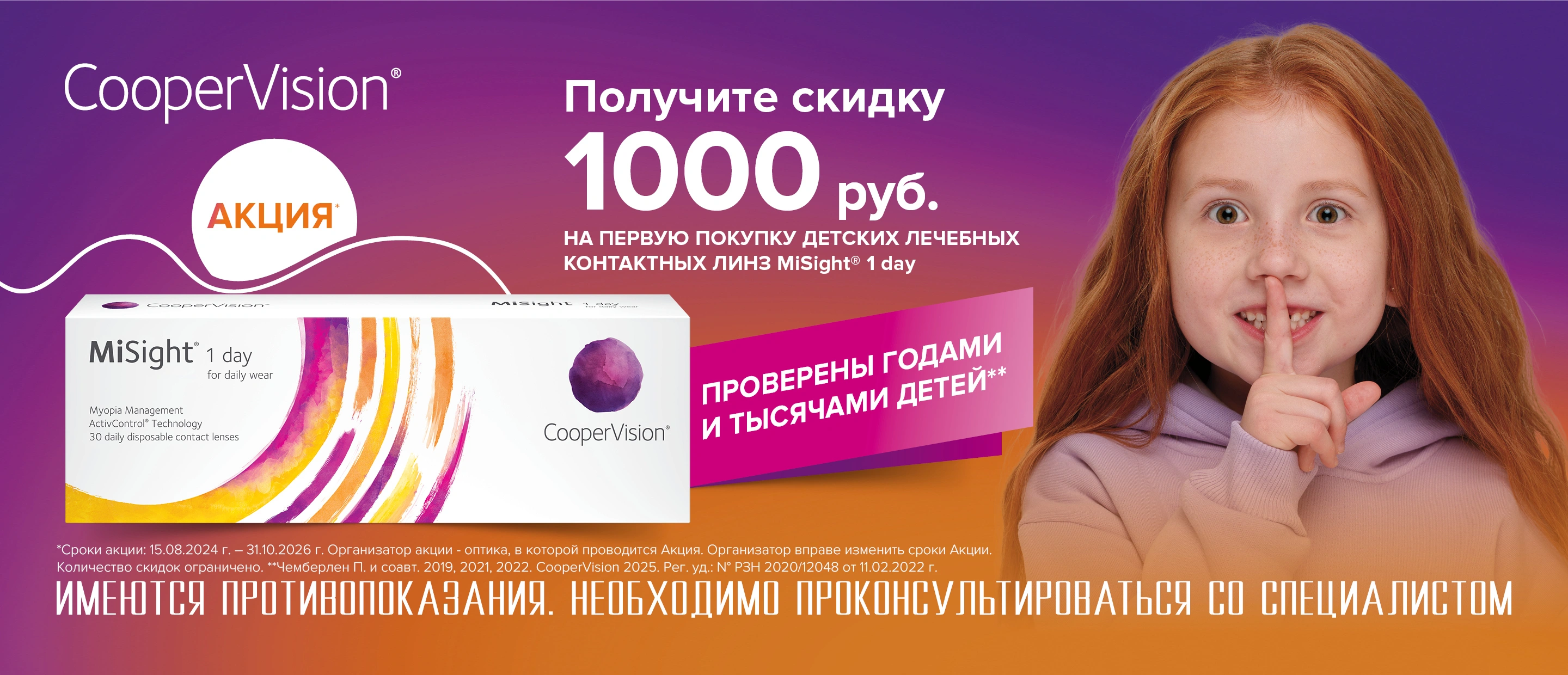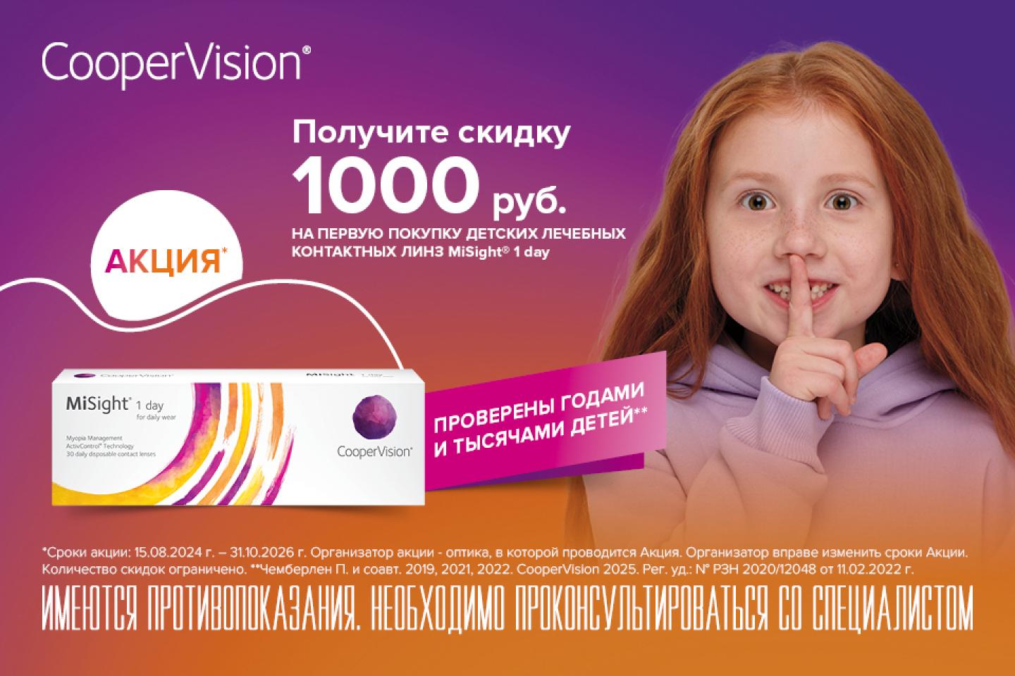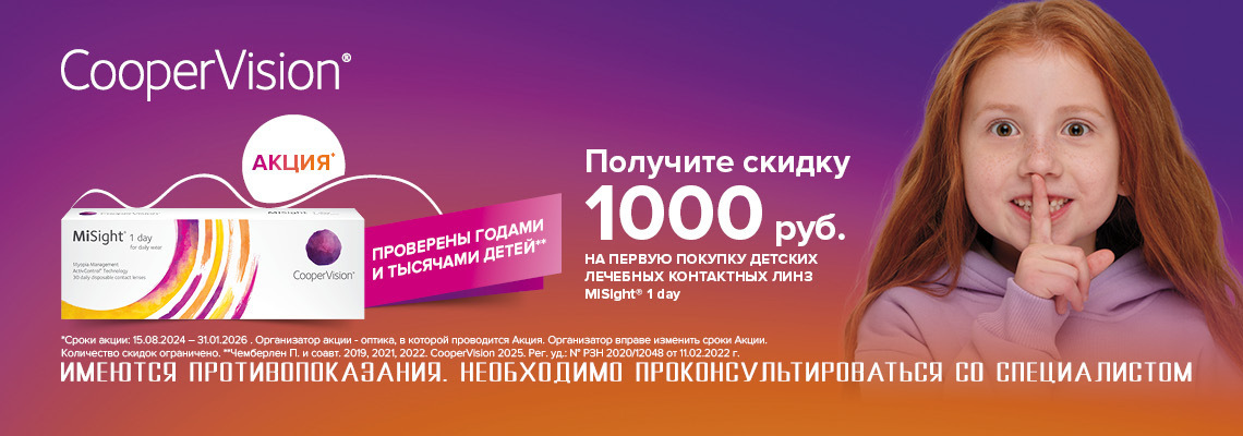 Пройдите осмотр и получите 1000 р скидки на упаковку линз MiSight® 1 day