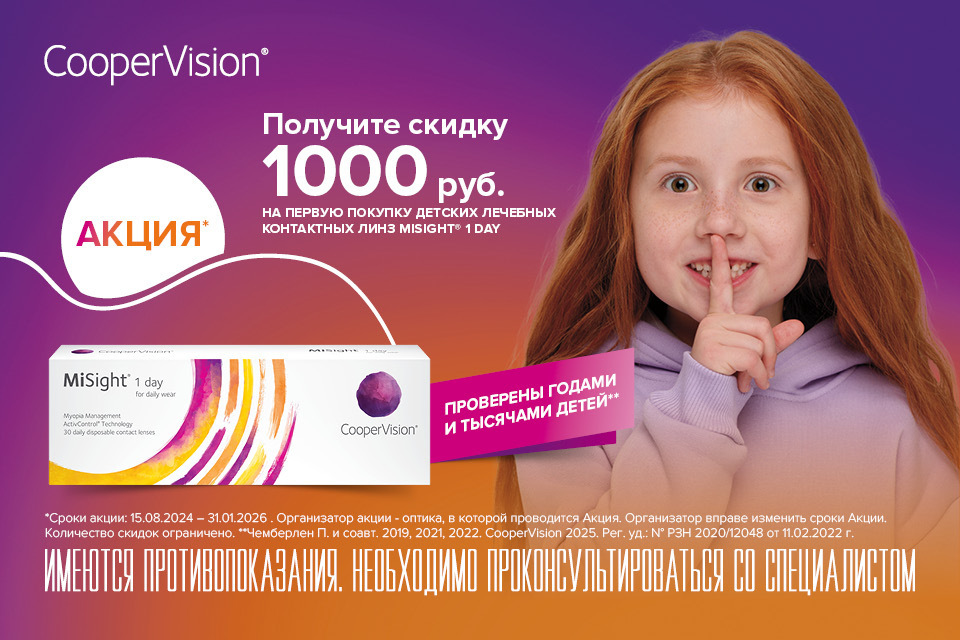 Пройдите осмотр своего ребенка 8-17 лет (услуга может быть платной, уточняйте в оптике), специалист осуществит первичный подбор MiSight® 1 day (при соответствии диагноза и отсутствии противопоказаний) и купите упаковку MiSight® 1 day (30 или 90 линз) со скидкой 1000 рублей